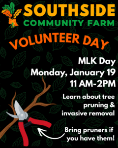 Join us for a volunteer day at Southside Community Farm and Orchard! We will be pruning apple trees and other perennials, removing invasive species, and cleaning up our orchard space. Please dress appropriately for the weather, and if you have a pair of hand pruners, bring them along! All are welcome.