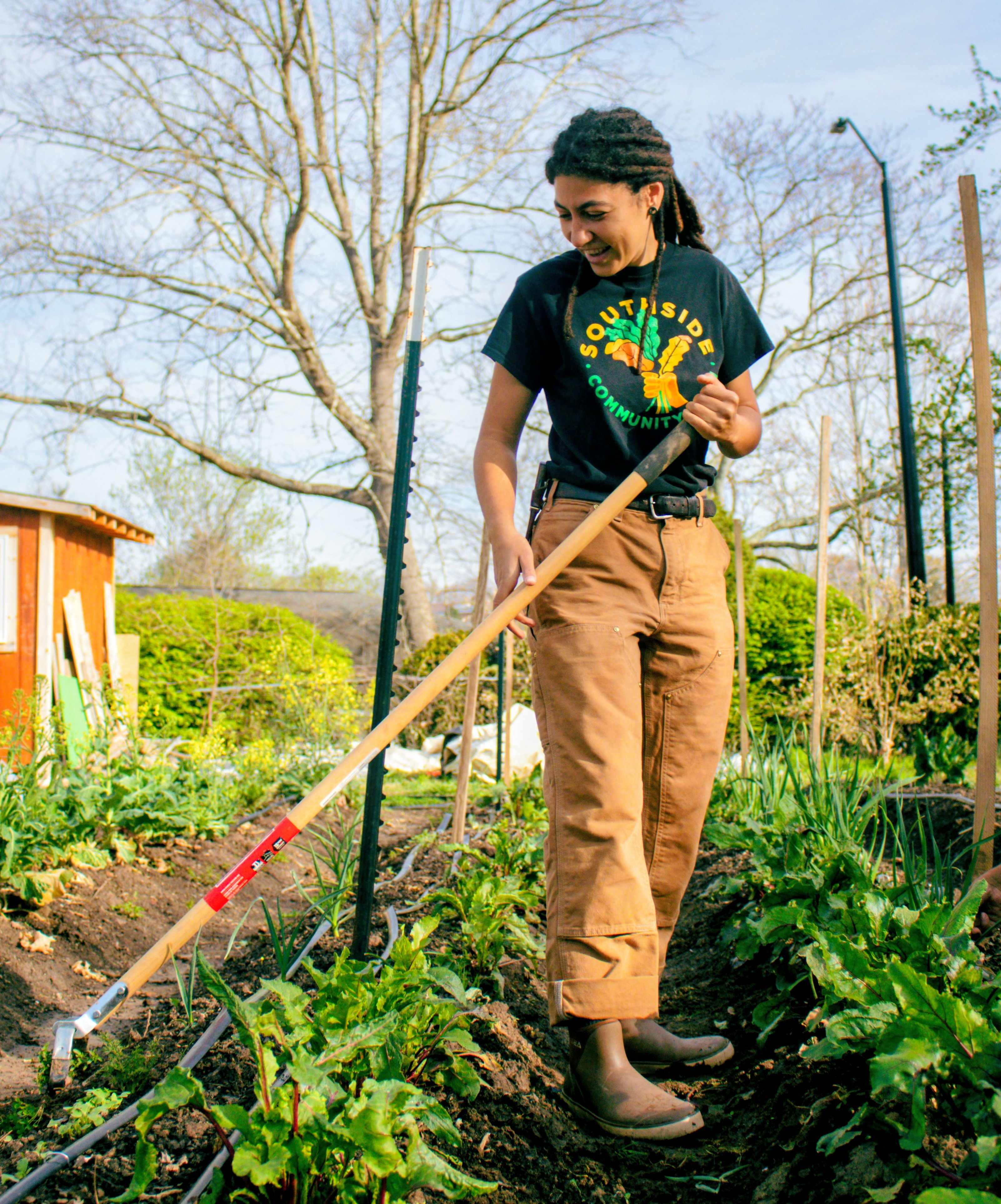 Chloë Moore (he/she) serves as farm manager, where she grows and distributes healthy food and leads events such as BIPOC-only garden days. Chloë strives to reconnect people of color with land and food in ways that feel empowering, restorative, and delightful. He is a queer, Black and Borikua-Taino, land steward, educator, and parent who loves to eat good food, sing to plants, and play in the dirt. Chloë is also a co-creator of Liberation Tools.