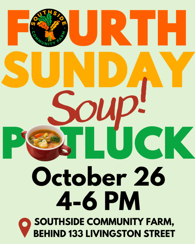 Soup season is here! Join us at the farm for Fourth Sunday Dinner on October 26th, 4-6 PM. Bring your favorite pot, a bowl, spoon, and a friend. Let’s stew and hang together. This will also be a grateful send off to Farmer Kate, who is ending their time at Southside Community Farm after 7 years of dedicated work. Let’s celebrate Kate in all their awesomeness!